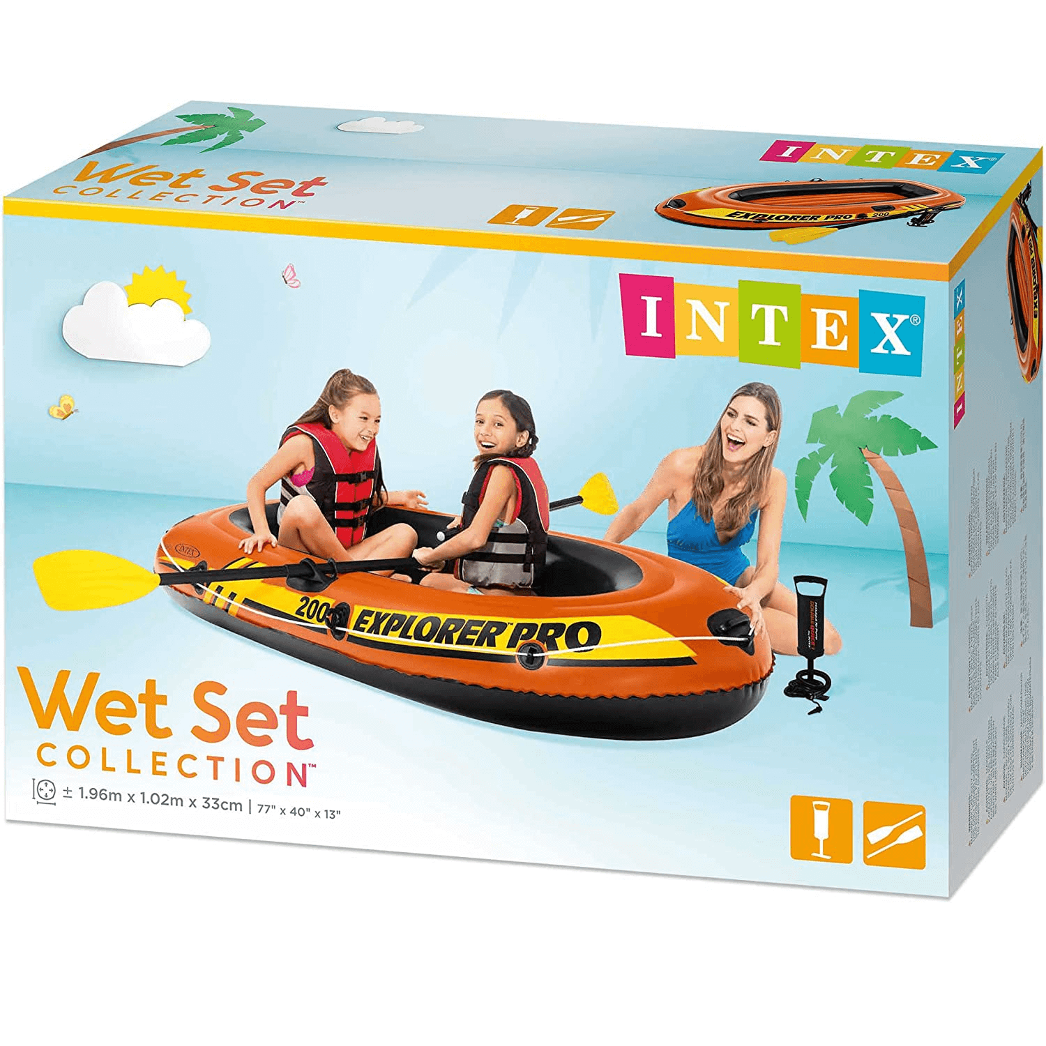 A csónak felfújt állapotban 196 x 102 x 33 cm nagy és 120 kg teherbírással rendelkezik, így gond nélkül meg tud tartani 2 személyt. A szettbe tartozik 1-1 műanyag evező és egy pumpa. Anyagából kifolyólag könnyed evező, bordázott lapátfejjel felszerelve, ami által az evezés még nem volt ilyen könnyű. A pumpa segítségével a csónak felfújása és leeresztése szinte gyerekjáték, hiszen oda-vissza fújási móddal is rendelkezik.