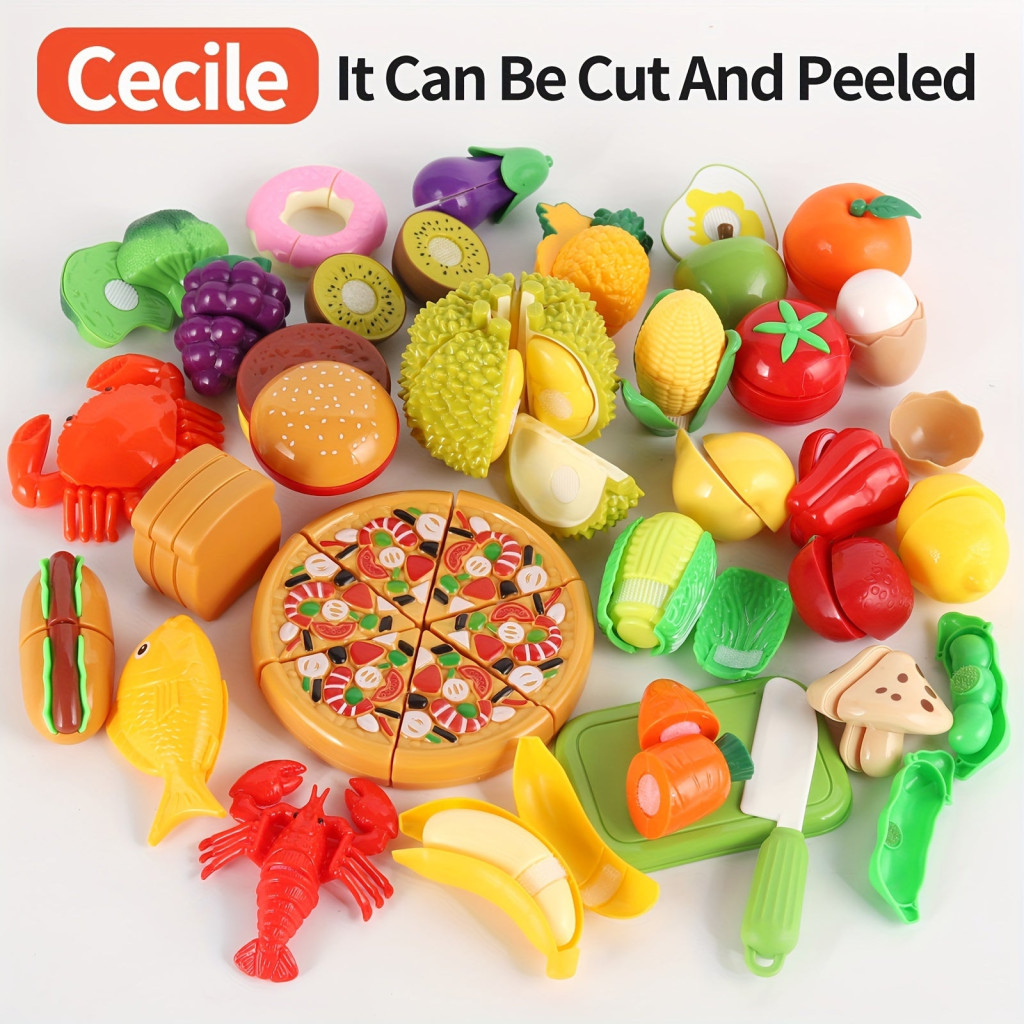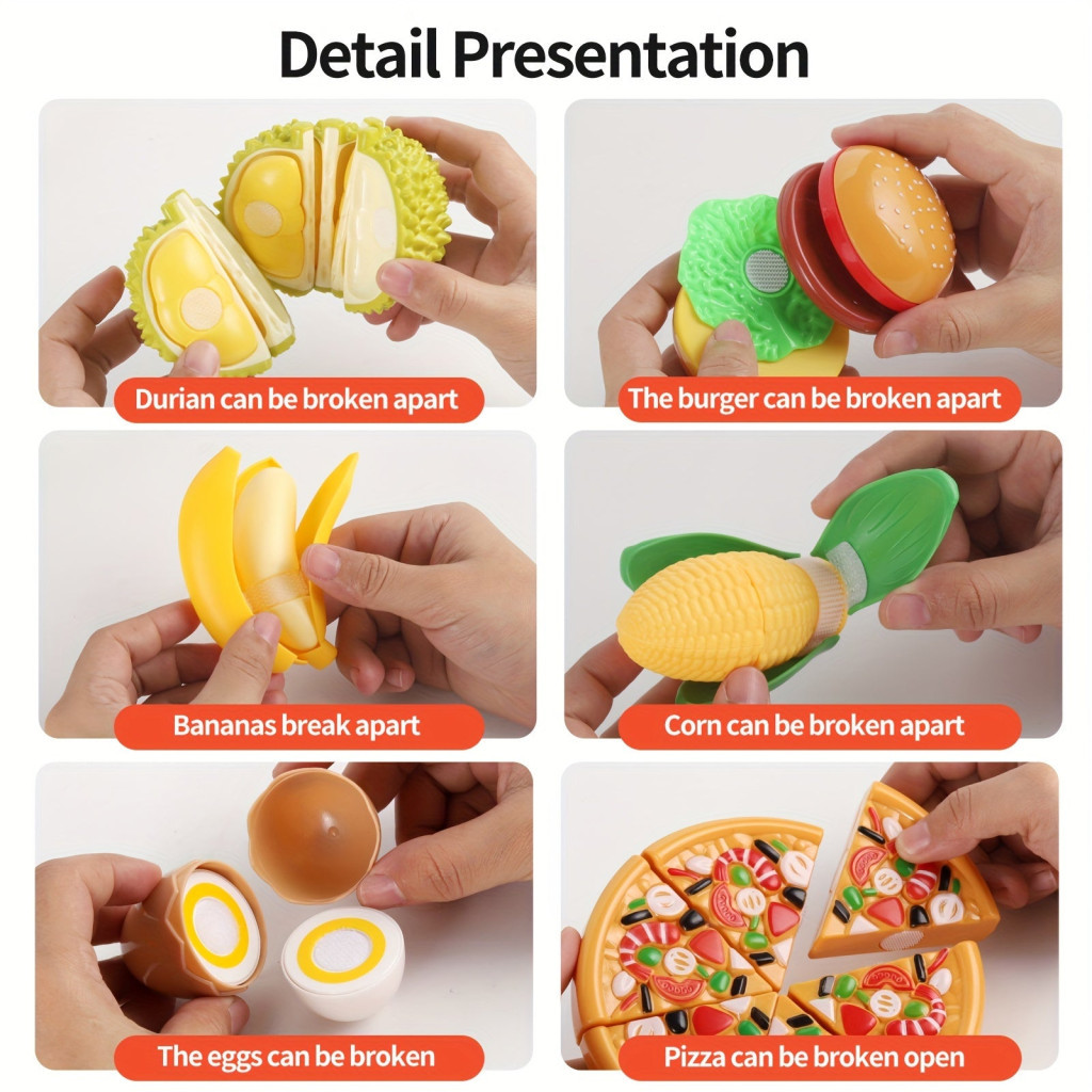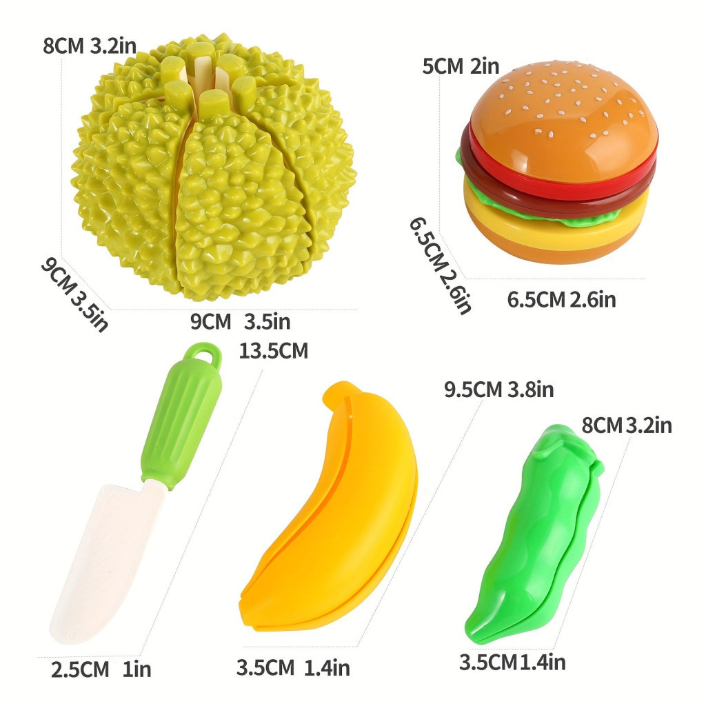 (Élethű részletek) A készlet minden darabja gondosan megtervezett, hogy a lehető legélethűbb élményt nyújtsa a gyerekek számára. A gyümölcsök és zöldségek textúrája és színei valósághűek, így a gyerekek könnyedén azonosíthatják őket.