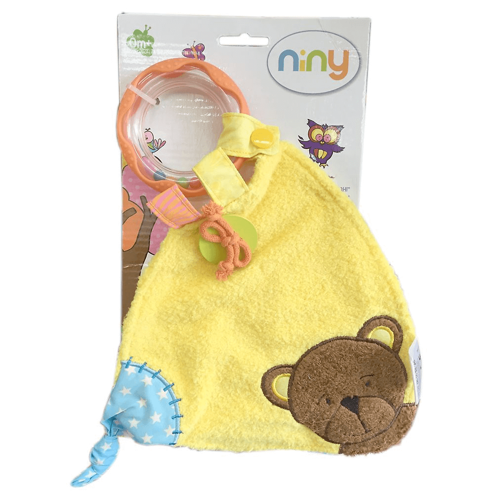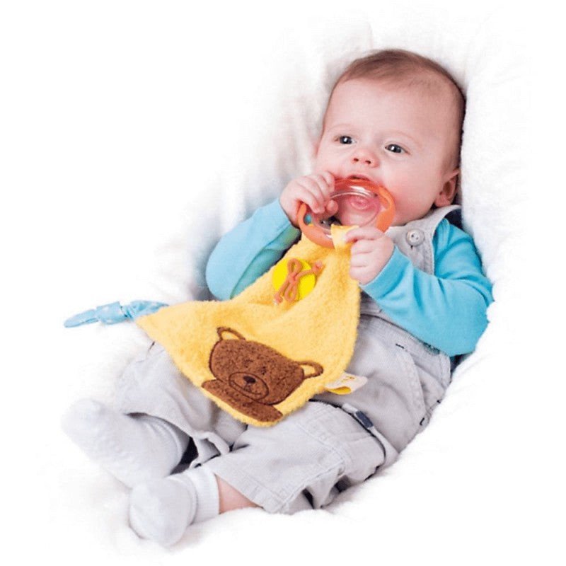 A játszókendőn található  egy rágóka, ami segíti a fogak előbújását. A termék felakasztható, zörög és csörög, amellyel elvonhatod a gyermek figyelmét. Színe, formája és fogása fejleszti a gyermek kézügyességét, szem koordinációját és élénkíti az érzékszerveit. Plüss anyaga által a játék könnyed, puha és kellemes tapintású. A termék nem tartalmaz semmilyen egészségre káros anyagot, így már újszülött kortól használható.