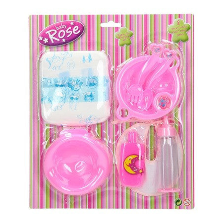 Ebben a készletben rengeteg hasznos kiegészítő található a játék babákhoz, mint például pelenka, bili, kistányér, evőeszközök, cumisüveg, előke stb. A kislányok a szett segítségével könnyedén utánozhatják majd az anyukájukat. A készletben található pelenka 35-55 cm nagyságú babáknak alkalmasak.