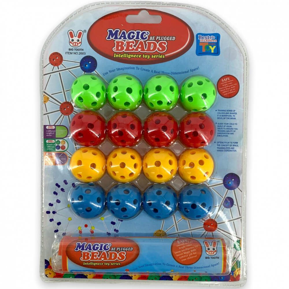 A játék szabálya egyszerű: a csomagban található pálcák és a mélyedésekkel ellátott gömbök segítségével építsetek bármit, ami eszetekbe jut. Határt csak a képzeletetek szabhat! A készletben 16 darab színes, lyukacsos golyót találtok, illetve több darab, 4 különböző méretű műanyag pálcikát. A fejleszti a gyermekek kreativitását, kézügyességét, és finommotorikus képességeit.