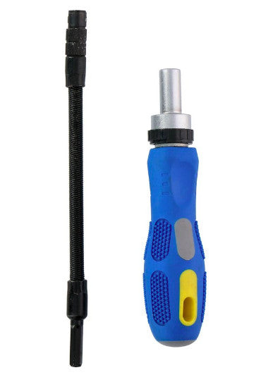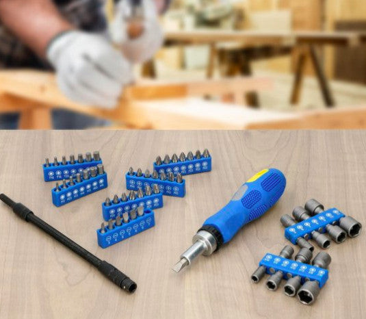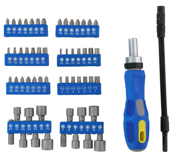 A szerszámkészlet egy 42 bites bitkészletből, egy 14 foglalatos foglalatkészletből, egy racsnis fogantyúból és egy hosszú, rugalmas hosszabbítóból áll. A sokféle alakú és méretű bitekkel és kupakokkal számos csavart, csavart és anyát meghúzhat vagy meglazíthat.