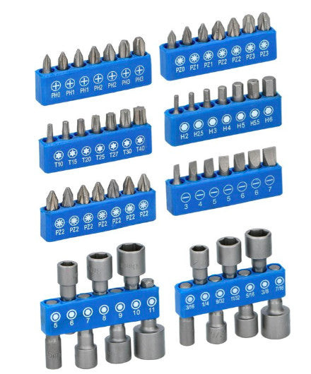 A készlet 14 méretű sapkát és összesen 42 bitet tartalmaz különböző méretben és kivitelben: hatszög / imbusz (H), keresztfej (PH), lapos fej, pozidriv (PZ) és torx (T). Ezzel megspórolhatja, hogy csak egyetlen csavarhúzót, imbuszkulcsot vagy dugókulcsot keressen.