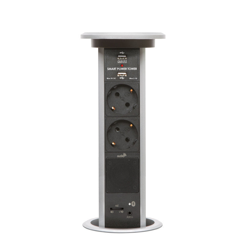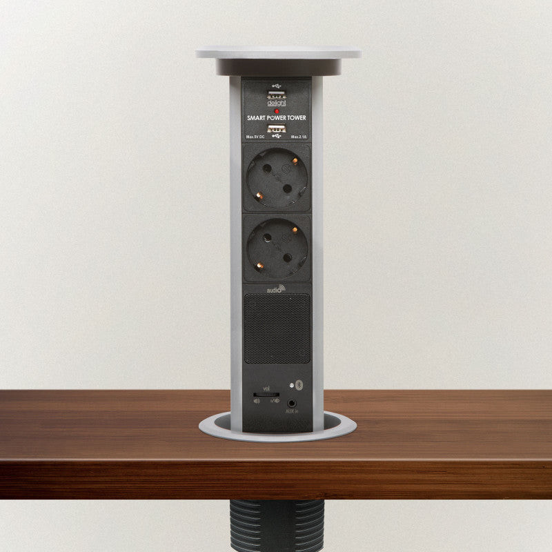 Motorosan süllyeszthető rejtett elosztó irodai és otthoni felhasználásra, fém házzal, 2 db gyermekvédelemmel ellátott hálózati aljzattal, dupla USB töltőegységgel, hangszóróval és bluetooth csatlakozási lehetőséggel. Hallgasson zenét például a konyhában vagy irodában az asztalába épített hálózati elosztó segítségével. Párosítsa össze mobilkészülékével (android, IOS támogatás) vagy csatlakoztassa AUX 3,5 mm-es kábelen keresztül.