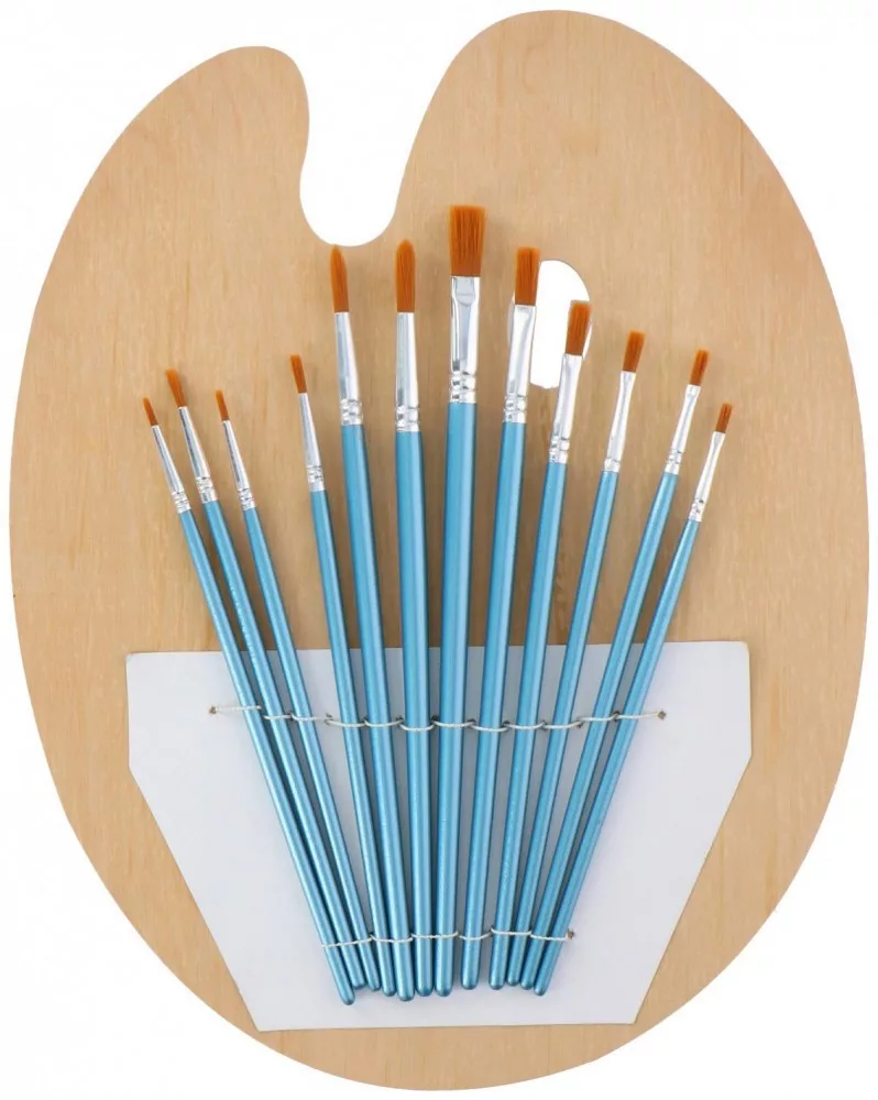 A 12 darab ecset közül minden fajtából találsz a szettben. A csomag egyaránt tartalmaz 6 darab kör és 6 darab lapos ecsetet is. Ráadásul nem kell külön palettát is vásárolnod, hiszen a szett tartalmazza azt.