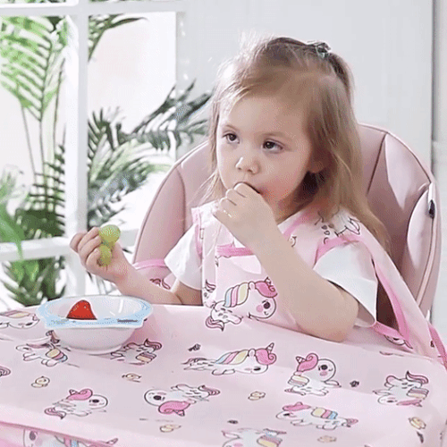 Etetőszék tálcára rakható vízálló védőhuzat és hosszú ujjú ruha kisgyermekeknek