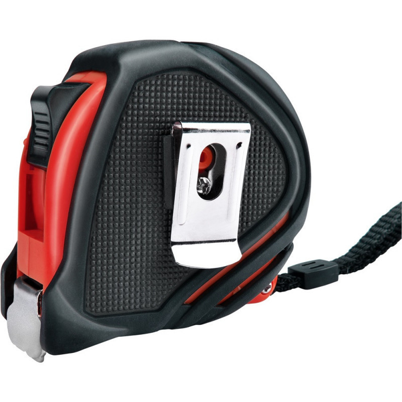 A gumiborítás és az ergonómikus csúszásgátló elemek megvédik a mérőszalag műanyag testét. Önfeltekercselő szerkezetnek erős rugója van. A STOP gomb csúszásgátló felületkezeléssel rendelkezik.Az íves profilú acél szalag sík helyzetben tartását segíti a mérőszalagnak.