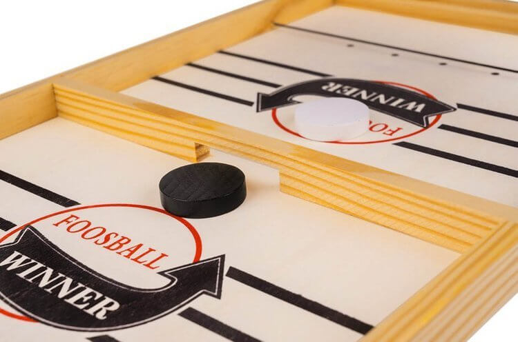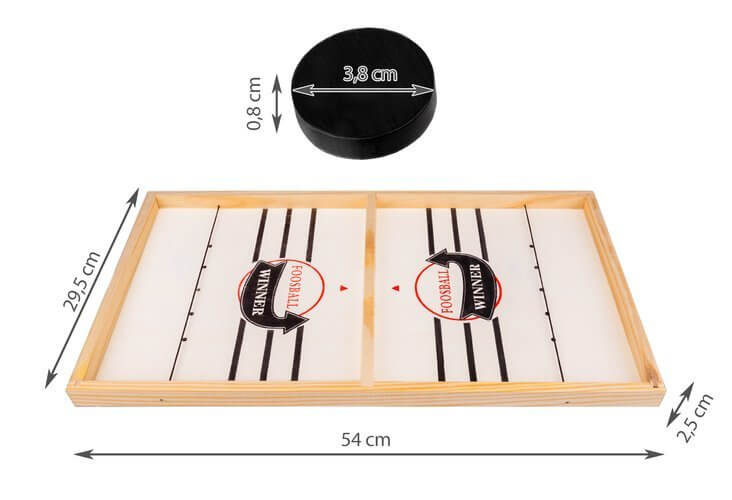 Ez a fa légkorong pálya két részre van osztva középen egy kis lyukkal, ahol át kell lőnöd a korongodat a másik térfélre, hogy megnyerd a játékot. Legyél te a gyorsabb, és az ügyesebb és győzz le mindenkit! Lövöldözni a beépített zsinórral kell, amelyet egy csúzliként használhatsz. Csak célozz és lőjj, majd jöhet a győzelem!