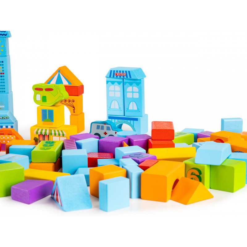 A kockák épületek, fák, járművek és különféle karakterek grafikájával rendelkeznek, így a kisgyermek saját városát hozhatja létre. A készlet tökéletes kiegészítője az otthoni autók, figurák és babák gyűjteményének, és korlátlan lehetőségeket kínál a szórakozásra.