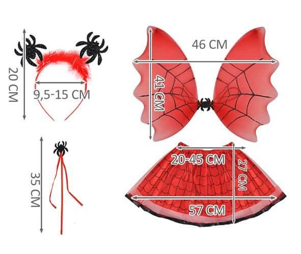 A készlet egy komplett ruhát tartalmaz: szoknyát, fejpántot, pálcát és szárnyakat. A tüll, enyhén kitáguló szoknya rugalmas szalagon van, alatta pedig fedőanyagból készült bélés van, ami azt jelenti, hogy a fehérnemű nem lesz látható, emiatt nem kell aggódnod. A szárnyak áttetsző anyagból készültek, továbbá fém keretük van, amely egyenesen tartja őket, miközben könnyűek. A rögzített rugalmas szalagok garantálják a gyors és egyszerű fel- és levételi kényelmet.