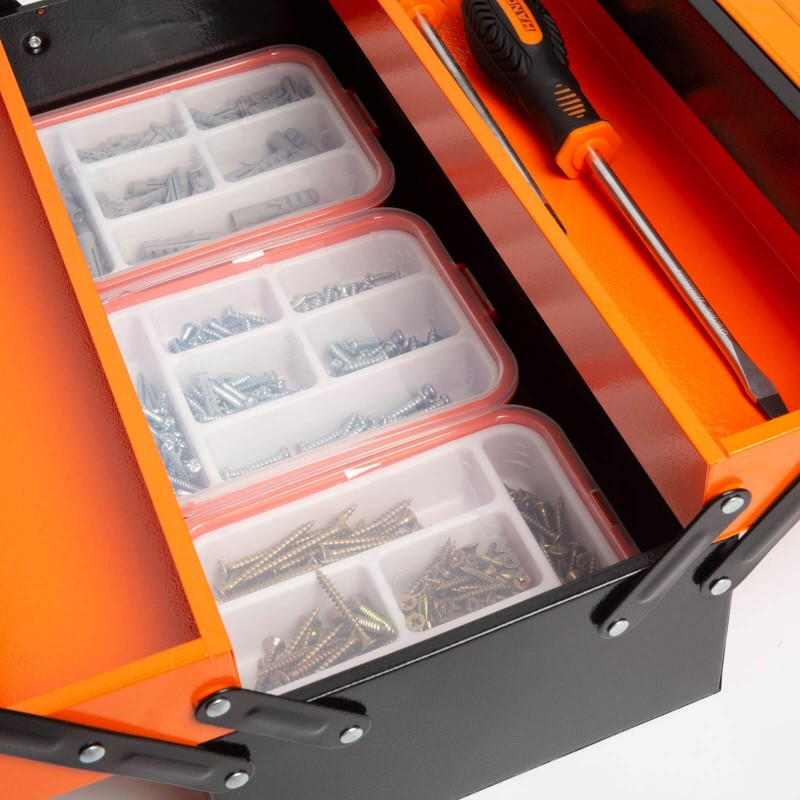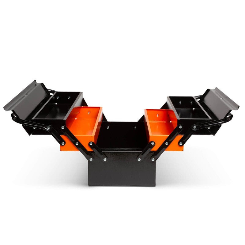 Klasszikus elrendezésű, harmónikaszerűen nyitható szerszámosláda. Strapabíró fémből készült, így ellenáll az intenzív használatnak is.