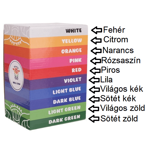 A szettbe 10 különböző szín tartozik: piros, fehér, rózsaszín, narancs, citrom, világos és sötét zöld, világos és sötét kék és lila.