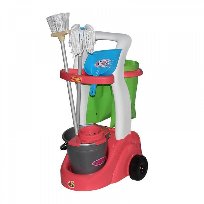 Ez a készlet mindent tartalmaz, ami egy takarításhoz szükséges: kiskocsit, vödröt, felmosót, partvist, lapátot, és még 2 darab szemeteszsákot is. A szett segítségével megtaníthatod gyermekednek, hogy hogyan takarítsa fel a lakást. Ezentúl nem lehet kifogás, hogy túl nagy a partvis, vagy a felmosó nyele! A húzható kocsival a kicsik is könnyedén magukkal tudják vinni a felszerelésüket.