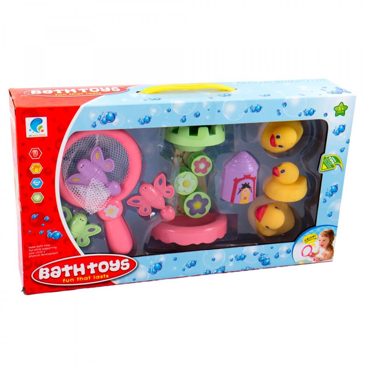 Ez a vidám, 9 darabos fürdőjáték készlet tökéletes minden apró csemete számára, aki szeret játszani. A segítségével a pancsolás is egy új móka forrása lesz. Ezentúl nem lesz probléma a fürdetés! A készletben három gumikacsa, három pillangó, egy kis vár alakú vízimalom, valamint egy királylány mintás kiegészítő szórakoztatja a kicsiket.
