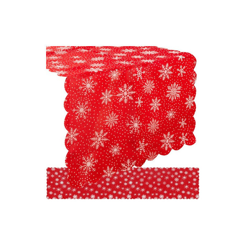 Varázsold ünnepivé az otthonodat ezzel a piros, hópelyhekkel díszített karácsonyi asztali futóval! Mérete 185 x 35 cm, így tökéletesen illeszkedik a legtöbb asztalra, hogy megteremtsd a karácsony varázslatos hangulatát.