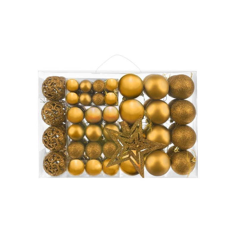 Varázsold el a karácsonyfádat ezzel a lenyűgöző arany gömb szettel! A csomagban 100 darab különböző méretű és mintájú díszt találsz, amelyek garantáltan mindenki tetszését elnyerik. A gömbök átmérője 3, 4 és 6 centiméter, felületük pedig matt, csillogó és fényes. Emellett nyitott mintázatú díszek is helyet kaptak a szettben. És a hab a tortán: egy gyönyörű csillogó csillag, ami tökéletes befejezése lesz a fád díszítésének.