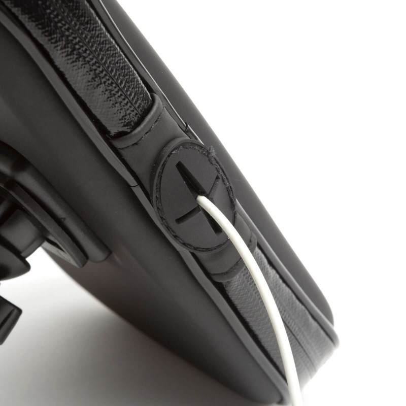 A kábelkivezető nyílás biztosítja, hogy akár fülhallgatóval is használható legyen, így könnyen fogadhatjuk a bejövő hívásokat is miközben biciklizünk. A vastag kialakítás lehetővé teszi, hogy ne kelljen kivennünk telefonunkat a tokjából, azzal együtt behelyezhető a táskába.
