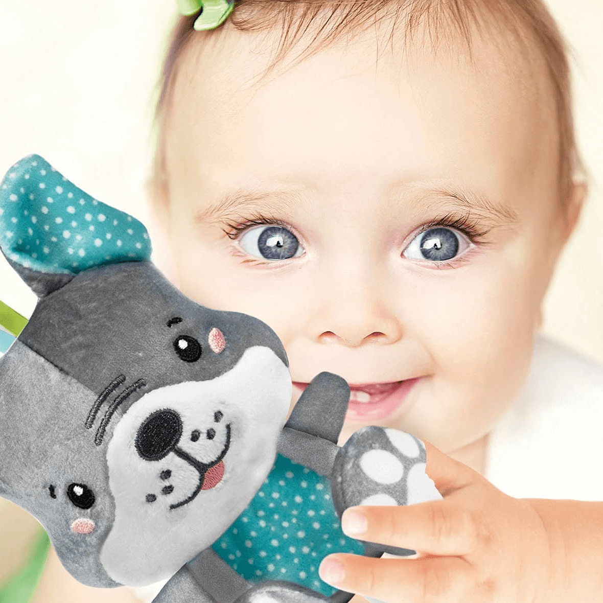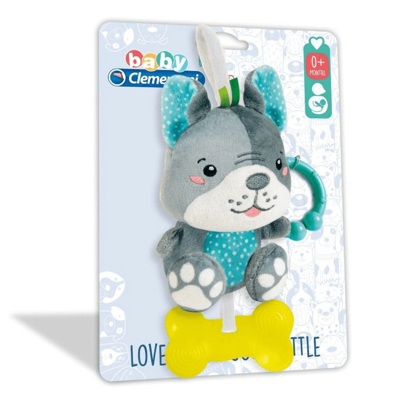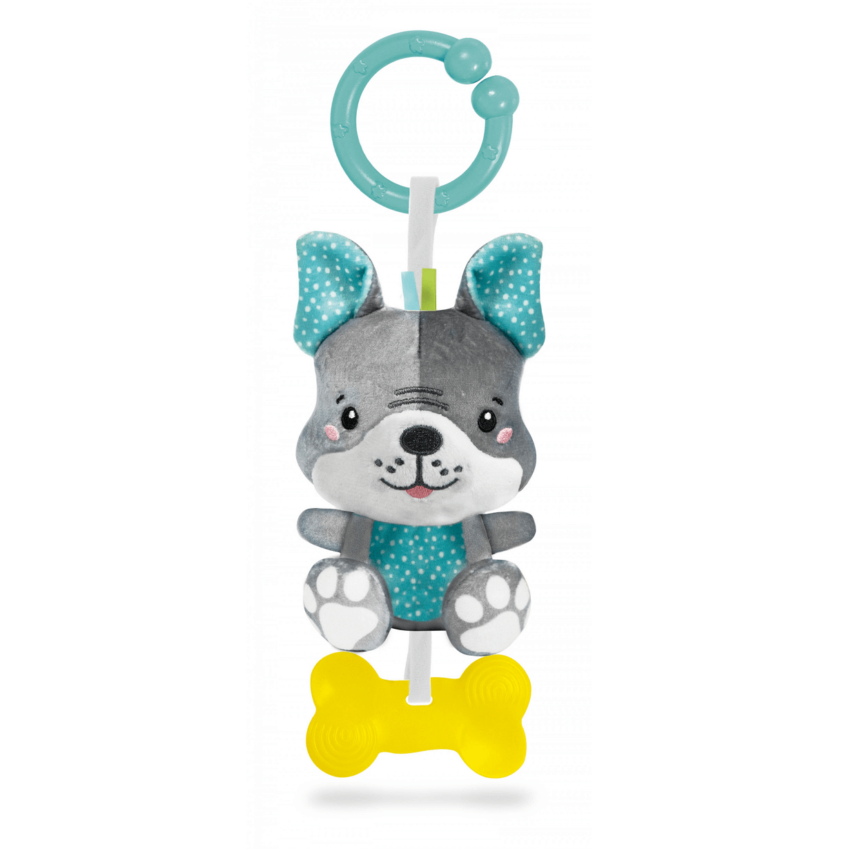 A termék a műanyag gyűrűnek és a fején található függesztőnek köszönhetően egyszerűen fellógatható bárhova. A kutyus fülecskéje és feje csörgővel lett megtöltve, így ha a gyermek megrázza, vagy megnyomja az rezegni és csörögni kezd. Ez ösztönzi őket finommotorikus készségük és kézügyességük fejlesztésére, miközben lefoglalja a gyermeket. Az alján található egy műanyag csont is amely a pici fogzásában lehet nagy segítség, hiszen rágása csillapíthatja a fájdalmat.