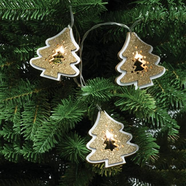 A fenyő mintájú LED fényfüzér tökéletes kiegészítője lehet a karácsonyfádnak. A fából készült, arany glitteres figurákkal garantáltan a Te karácsonyfád lesz a legtrendibb!