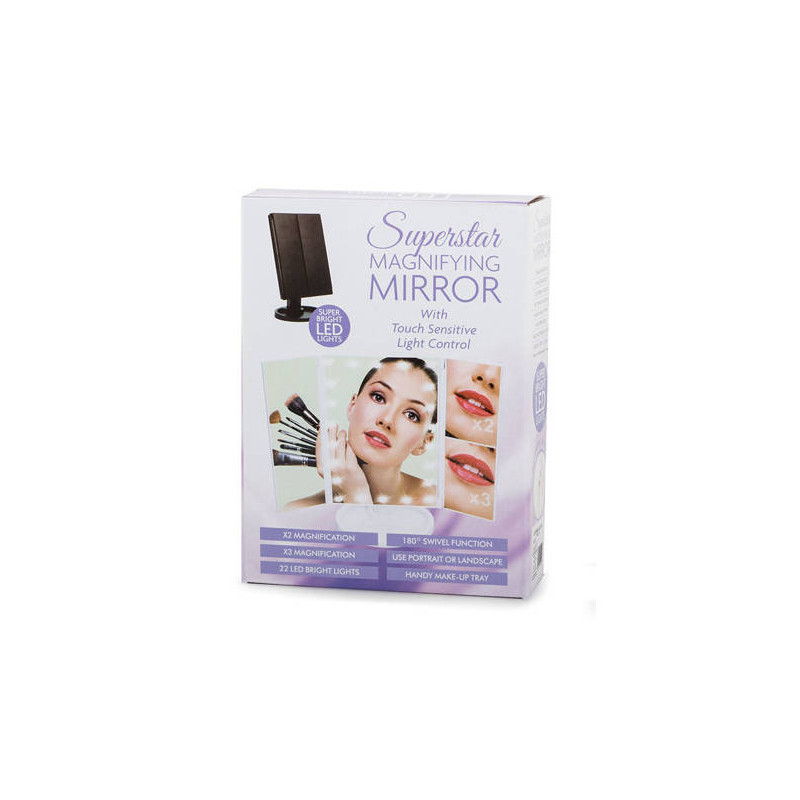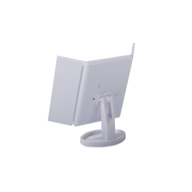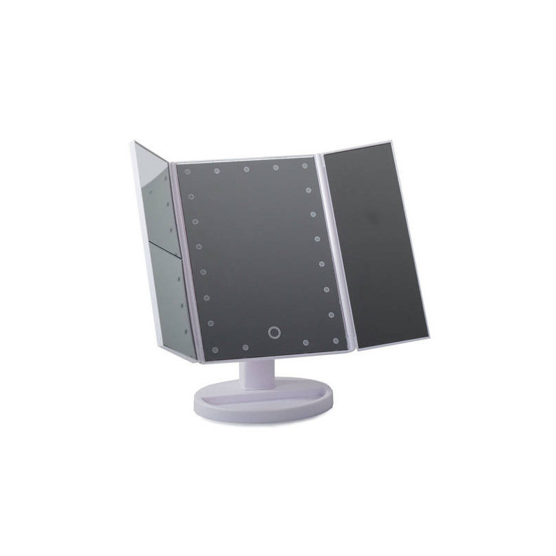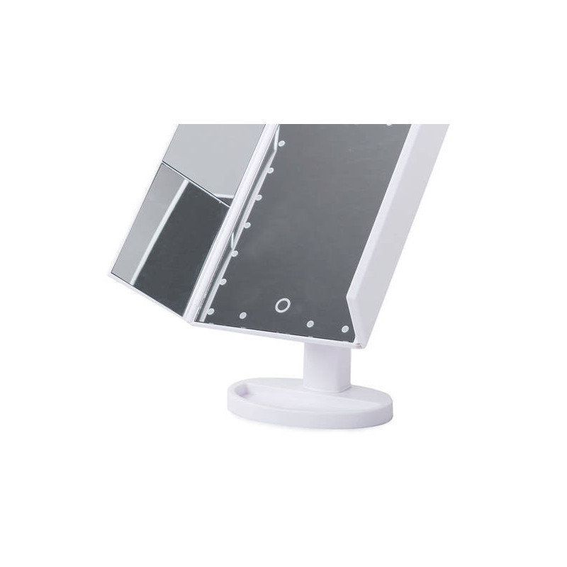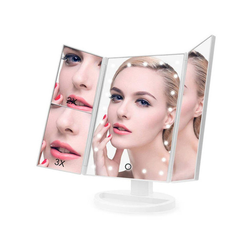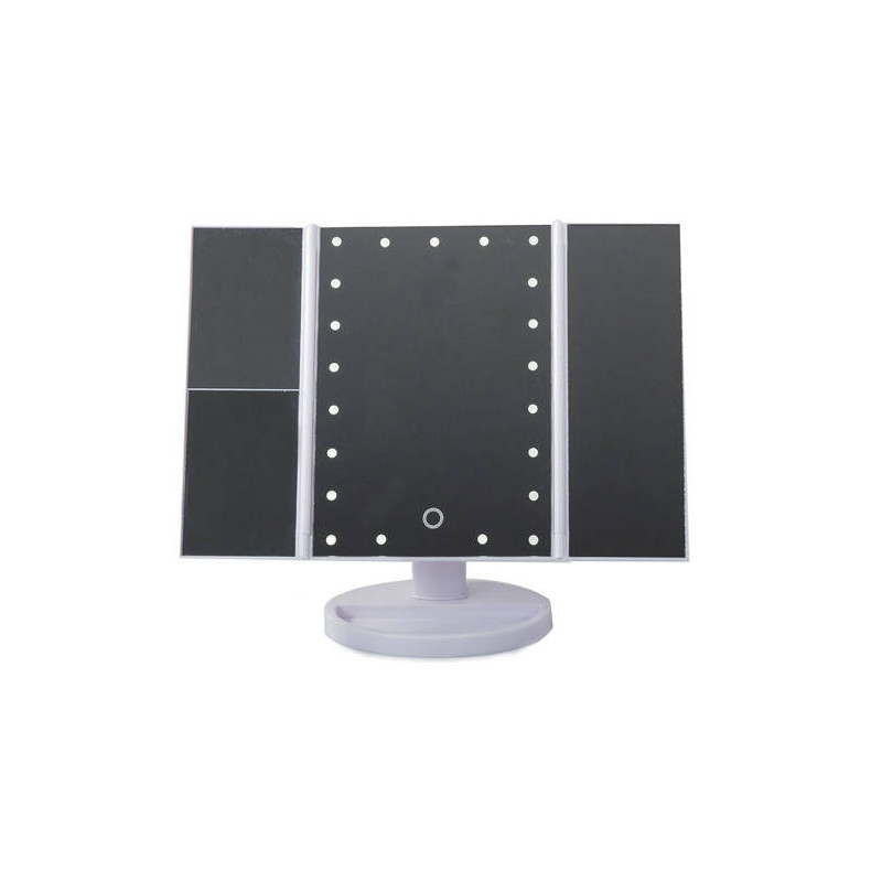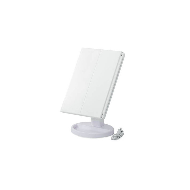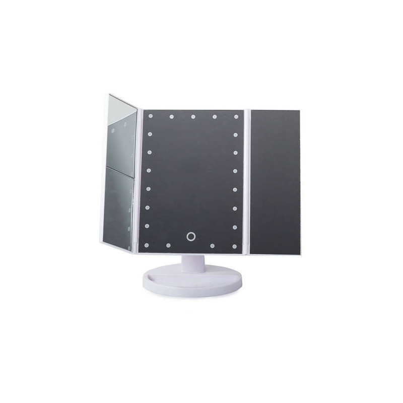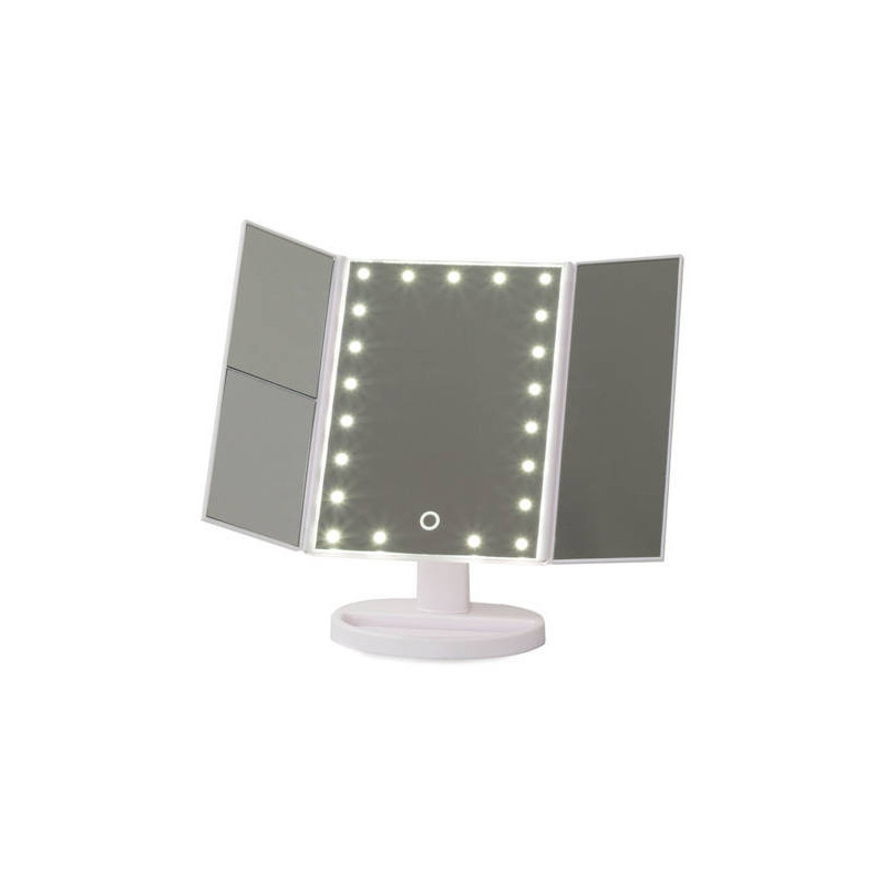 Ez a FÉNYEZETT TÜKÖR egy igazi must-have minden szépségmániás számára! A beépített 22 LED-es háttérvilágításnak köszönhetően mindig tökéletesen fogsz kinézni, bárhol is vagy! Használd a érintésérzékeny kapcsolót, hogy bekapcsold a világítást a tükörben! Az extra oldalsó tükröknek köszönhetően még részletesebben is megnézheted a sminkedet! A tükör fehér színű, ami illik bármilyen fürdőszobába vagy sminkasztalra!