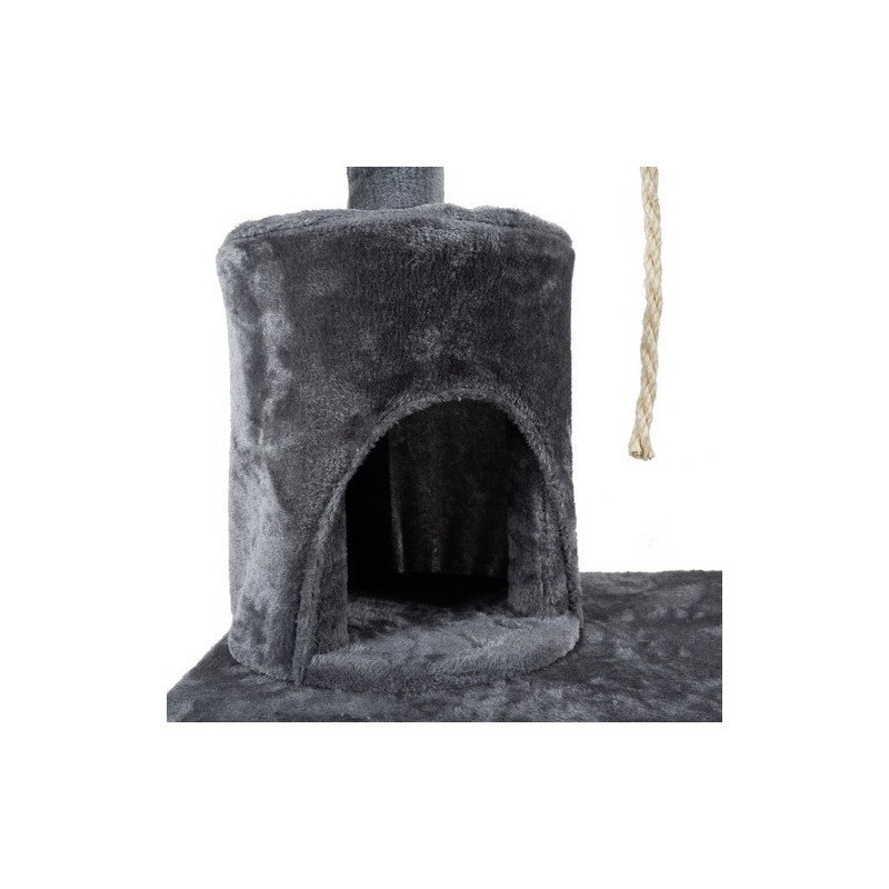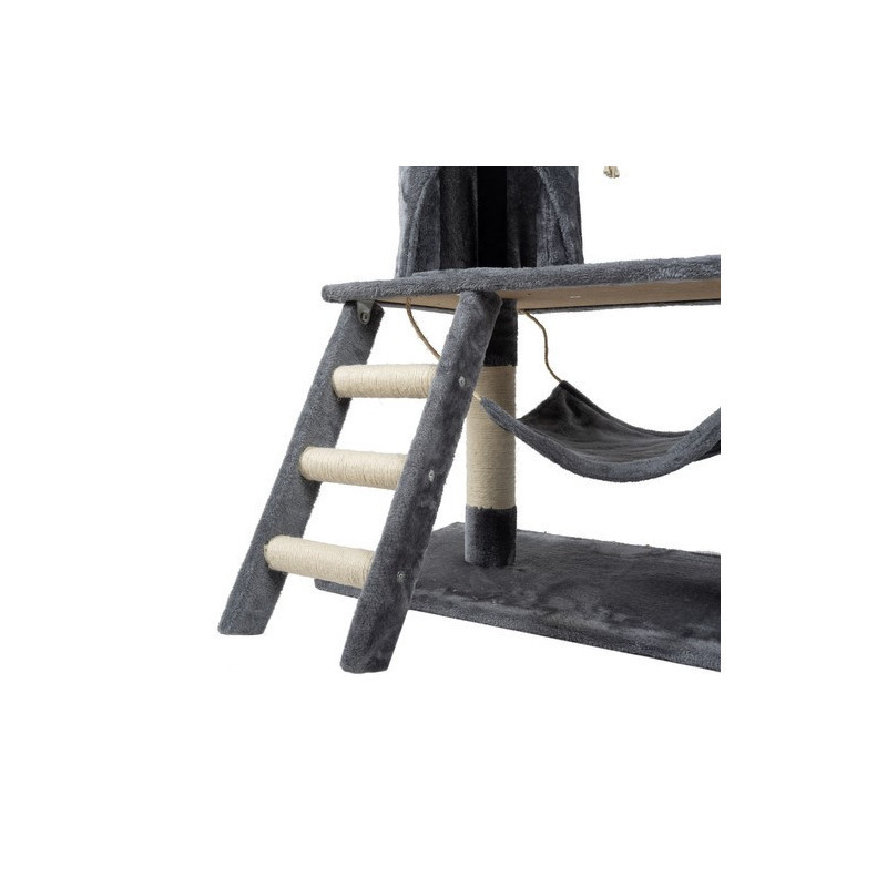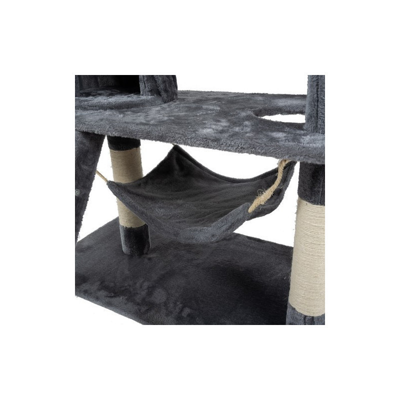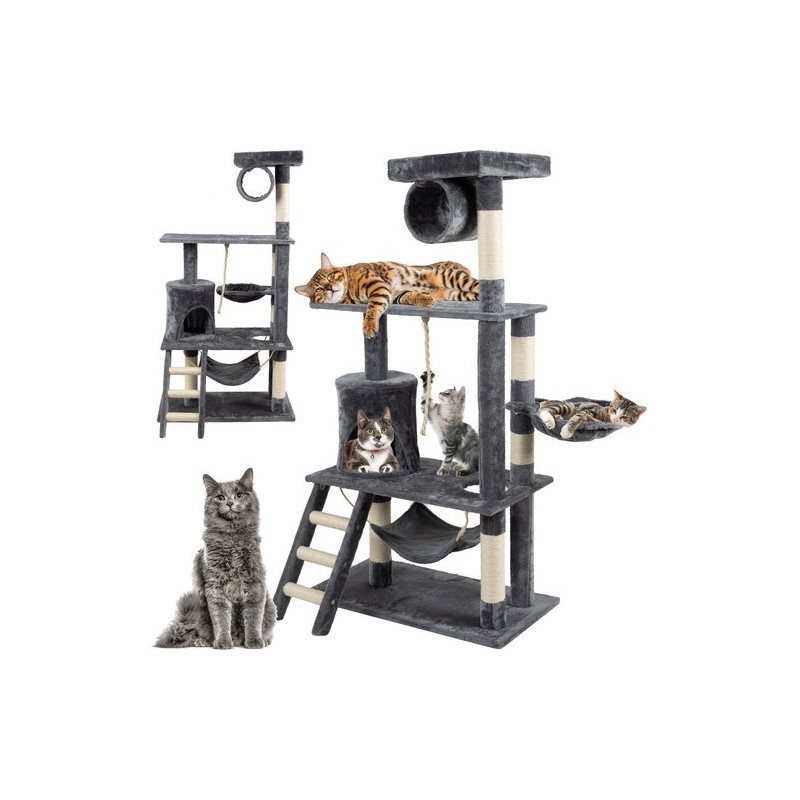 • Játék és mozgás: Ez a kaparófa tele van izgalmas elemekkel: platformok, függők, oszlopok, ágyikók és rejtett zugok várják a felfedező kedvű cicádat. Ugráljon, másszon, fedezzen fel – mindeközben remek formában tartja magát, és garantáltan nem fog unatkozni.