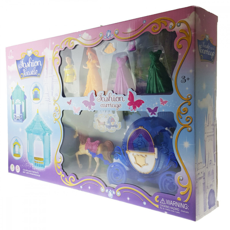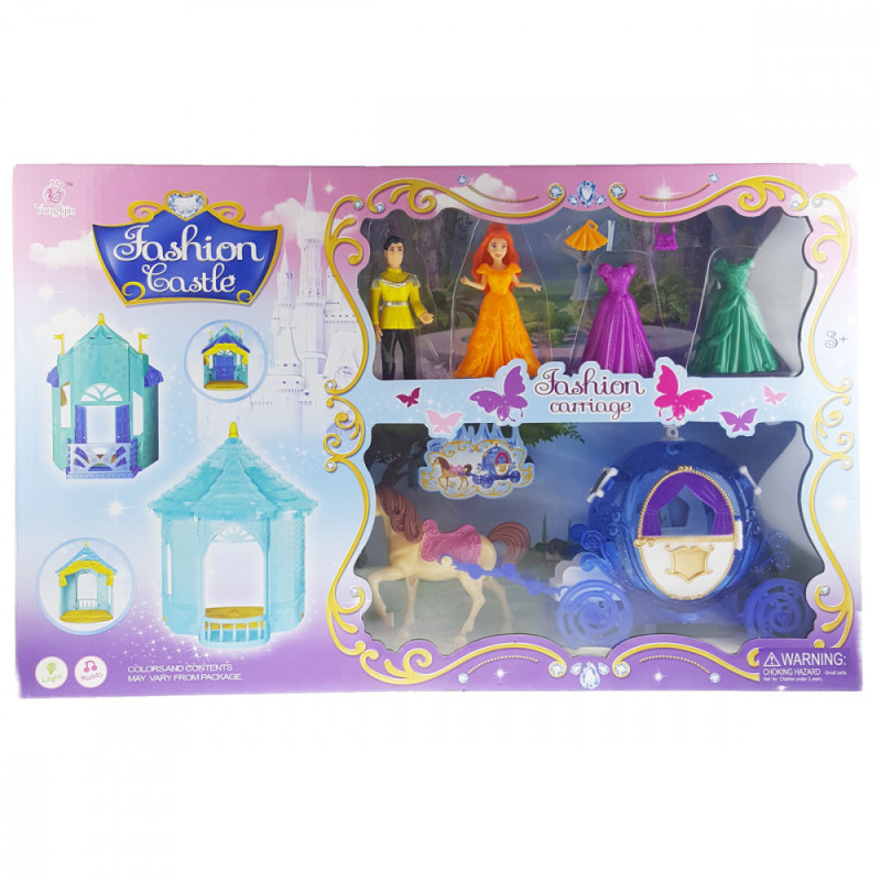 A hintó igazán kényelmes, díszített kerekek ékesítik. Öltöztesd a hercegnőt kedved szerint. A készlet egy herceget, egy hercegnőt, három különböző színű ruhát, egy kastélyt, hintót, lovat és két kiegészítőt tartalmaz.