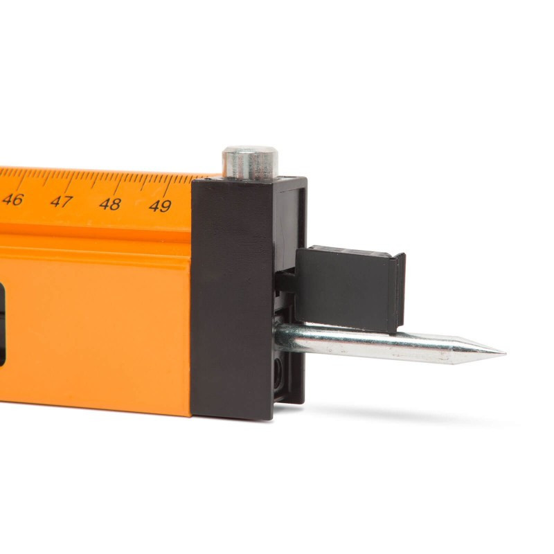 A két alumínium száron található: 2 x 50 cm vonalzó, állítható műanyag jelölők, valamint a szárba épített ceruzatartóban ácsceruza, így könnyen használhatjuk jelölésekre is. A tartozék körzőhegyeket a szár végén lévő gumifedelet kinyitva helyezhetjük a szár végébe, így körzőként is használható az eszköz. A körzőhegyeken túl, a tartozék ácsceruza is rögzíthető, de csak nagyobb szögek jelölésére. (Vagy igény esetén szükséges egy rövidebb ceruza)