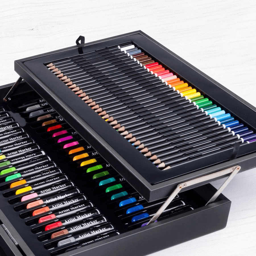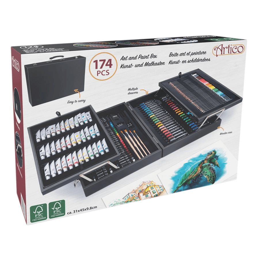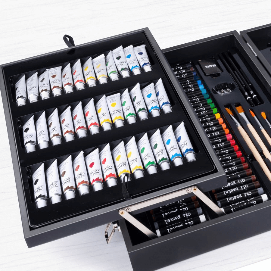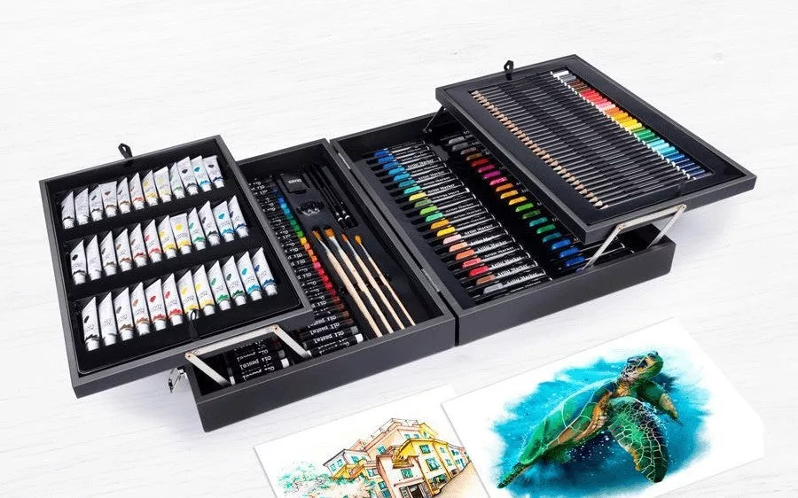 Ez a festéktáska minden művész szívét megdobogtatja tartalmának széles választékával. A jól felszerelt festőtáska, amely erős, fekete lakkozott fából készült és műbőr fogantyúval lett felszerelve kötelező darab minden festő, mázoló és grafikus számára. A tokban összesen négy különböző szinten 34 színes ceruza, 42 akvarell filctoll, 54 olajkréta, 12 tubus akvarellfesték, 12 tubus akrilfesték, 12 tubus olajfesték, 4 ecset, 2 ceruza, 1 radír és egy dupla hegyező jól szortírozva találja meg a helyét. Ekkora választék mellet egy művész sem mondhat nemet a táskának, hiszen nem csak hatalmas tartalma, de a rendszerezése is hívogató.