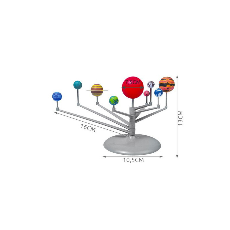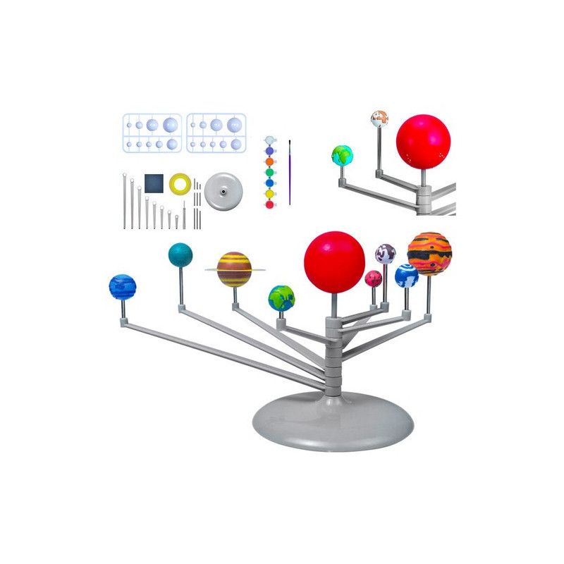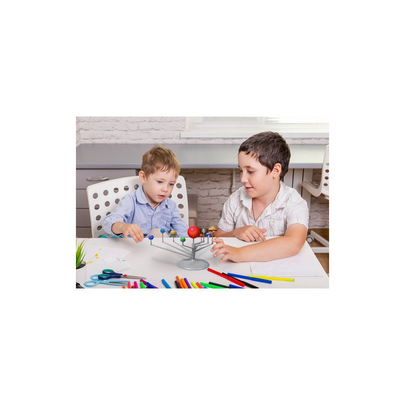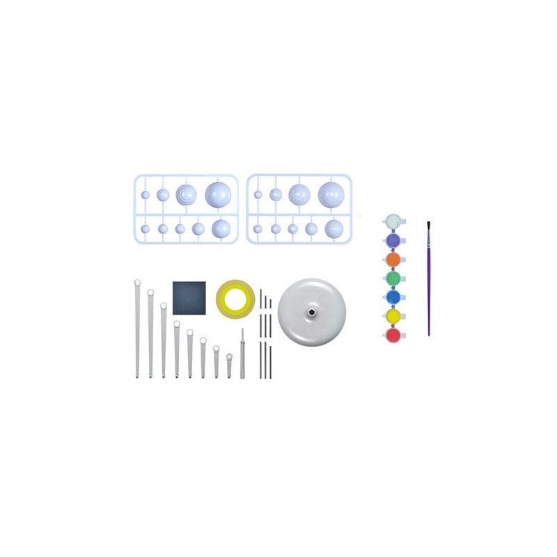 A modell összeszerelése gyors és könnyű, így a gyerekek önállóan is elvégezhetik, szülői segítség nélkül. Csak pattintsd ki a modell darabjait a sablonból, illeszd össze a bolygók feleit, majd helyezd a fém rudakat a bolygók alján lévő lyukakba, és rögzítsd az állványhoz. A bolygókat akár az összeszerelés előtt, akár utána is kifestheted.