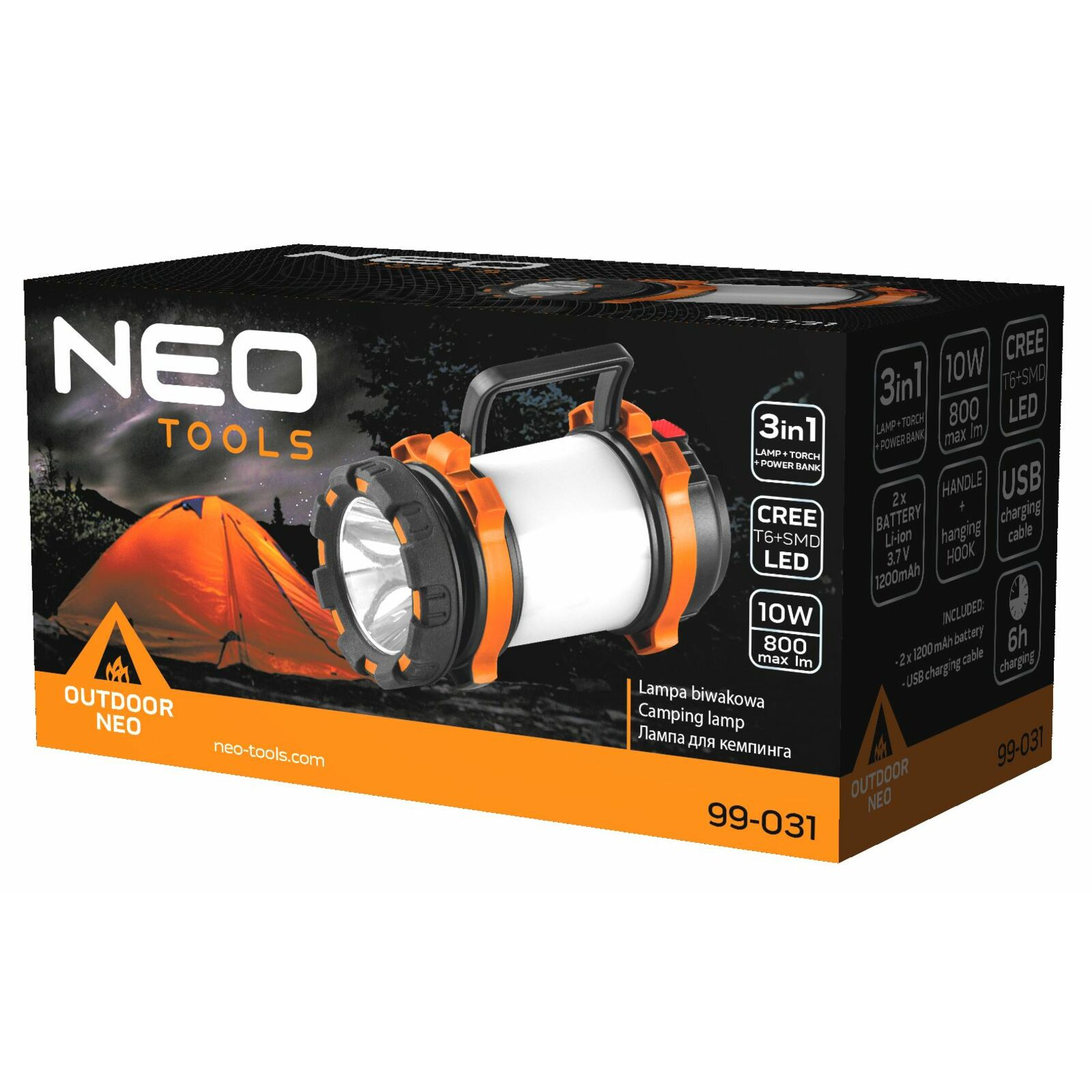 A multifunkciós 3 az 1-ben termék 4 világító funkcióval rendelkezik: zseblámpa, oldalvilágítás, piros oldalvilágítás valamint piros stroboszkóp oldalvilágítás. A NEO lámpát masszív felépítés jellemzi. Széleskörűen alkalmazható. A termék nagyon jól használható garázsban, pincében, különböző javításokhoz, de mindenekelőtt a városon kívüli kempingezéshez, sátorozáshoz, horgászathoz stb. A 800 lumen fényerejű és 10 W teljesítményű lámpa, modern CRI T6 + SMD LED-ekkel van felszerelve. Az európai biztonsági előírásoknak való megfelelőséget a CE tanúsítvány igazolja.