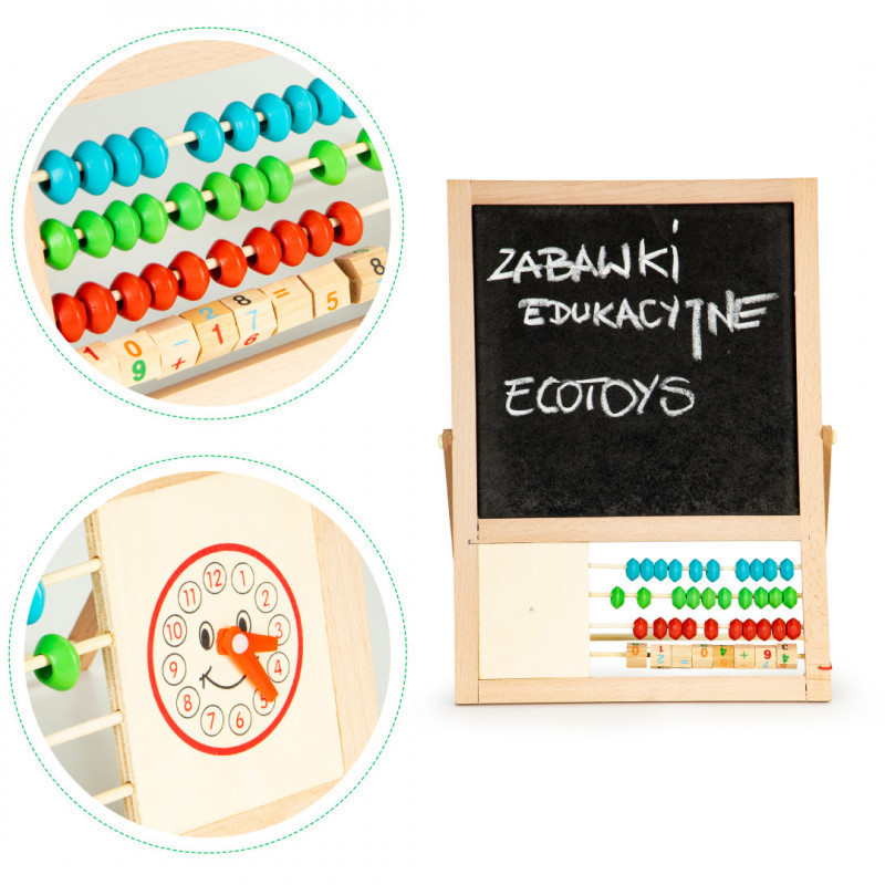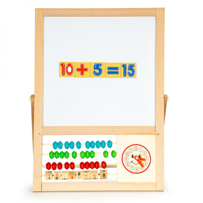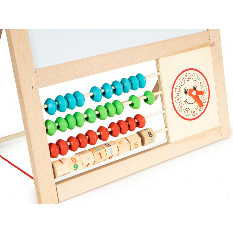 A tábla alatt színes számítókerék és egy extra bot található számokkal és matematikai műveletekkel, amelyek segítségével a gyermek játszva tanulhatja meg a számolás alapjait. Egy forgatható mutatóval rendelkező játékóra segít a gyerekeknek megtanulni az idő olvasását.