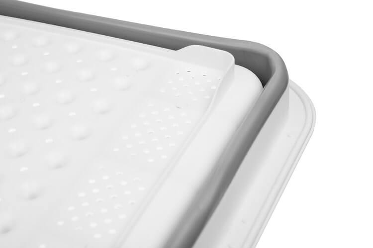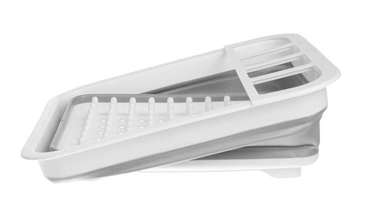 Kinyitva kb. 12 centiméter mély, így kényelmesen elhelyezhetők benne edények, tányérok is, míg összecsukva tökéletes bögrék, kistányérok szárítására. A konyhai kiegészítő alja lyukacsos, így nem marad benne az edényekről, bögrékről, evőeszközökről lecsepegett víz.