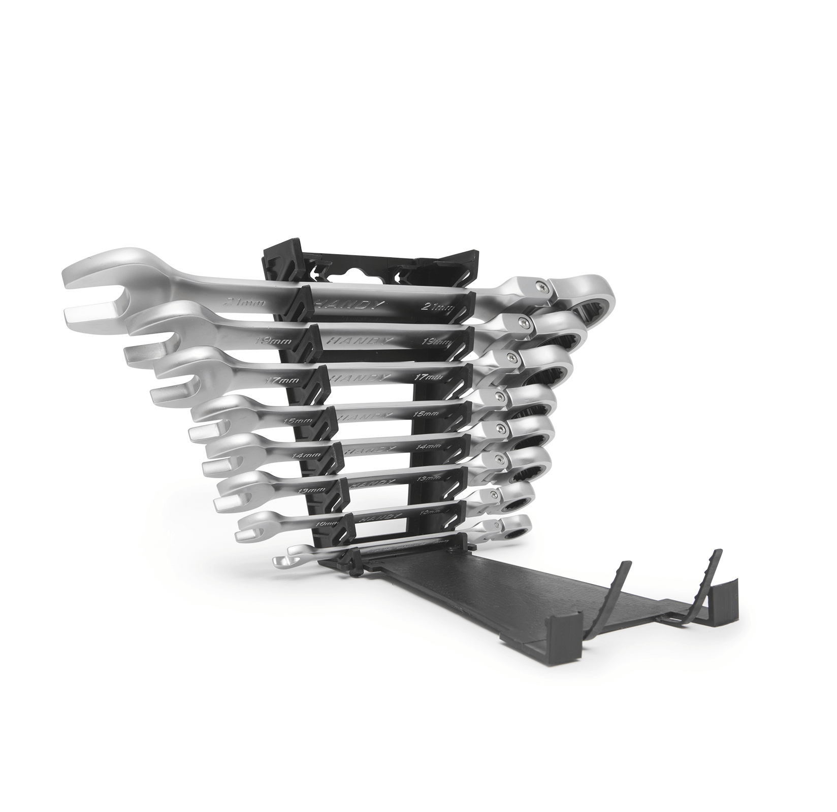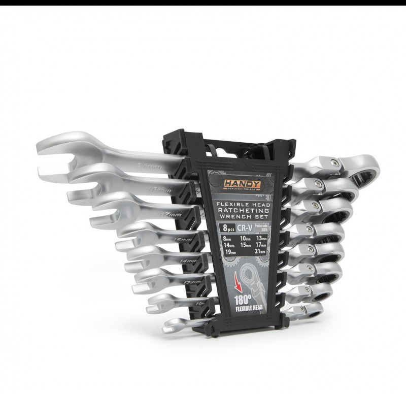Praktikus racsnis villáskulcs készlet, amelynek fejei 180°-ban forgathatóak. Ezáltal akár merőlegesen vagy szögben álló csavarokat is kihúzhatsz szűk helyeken is. A legtöbbet használt méretek találhatóak a készletben: 8,10,13,14,15,17,19,21 mm. Ergonomikusan kialakított nyele segíti az elvégzendő munkát. A praktikus műanyag tartóban egyszerűen tárolhatod az összes kulcsot, sőt akár a tartót fel is akaszthatod a falra, hogy még kevesebb helyet foglaljon és jobban kéznél lehessen szükség esetén.