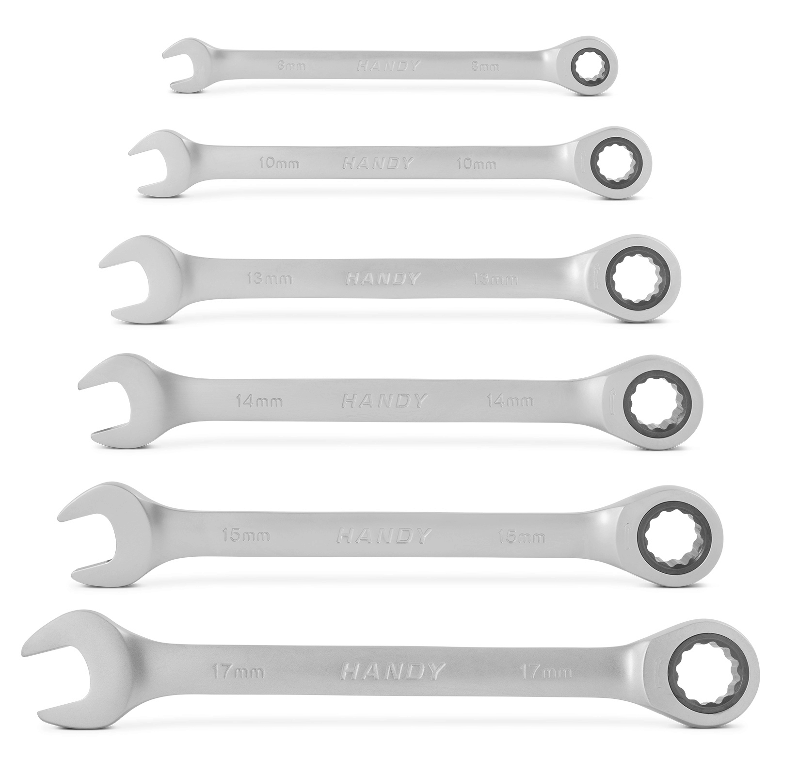 Egyszerű racsnis csillag villáskulcs készlet otthoni vagy akár munkahelyi használatra. A szettbe tartozó 8,10,13,14,15,17 mm-es kulcsok az alapvető szükségleteket elégítik ki. Tartós, króm-vanádium acélból készült aminek nagy a kopásállósága.
