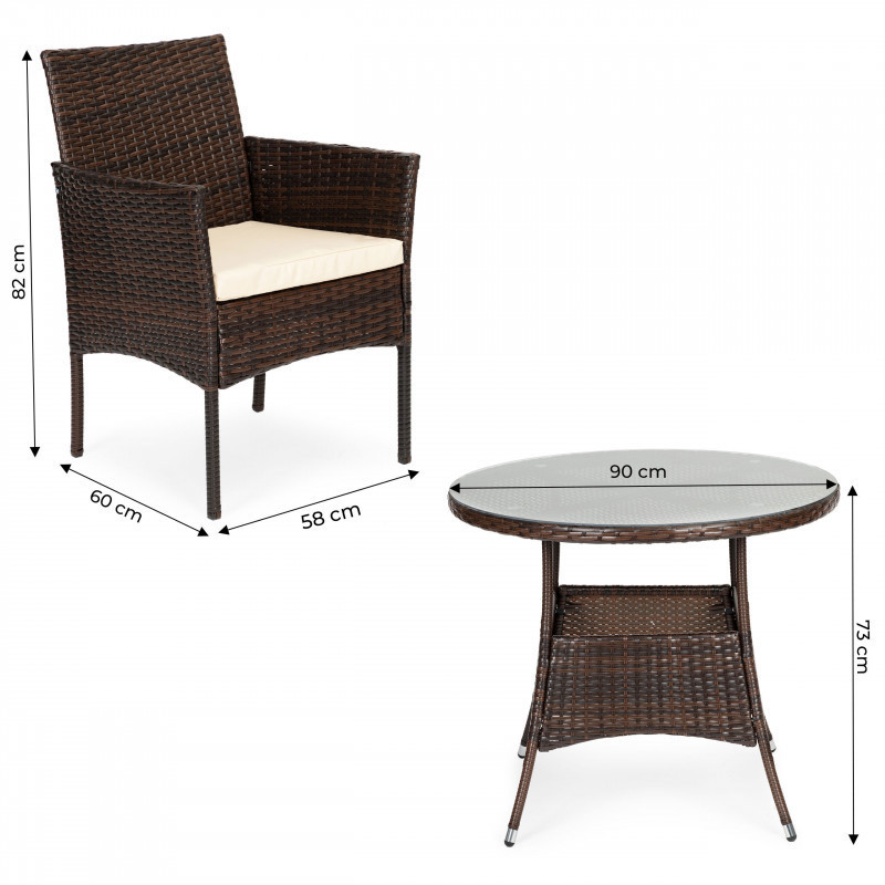 A készlet magas minőségű műanyagból - rattanból készült, amelyet magas tartósság és időjárásállóság jellemzi. A masszív, fém váz stabil és tartós bútort biztosít, ami sok szezonon át tartósságot garantál. A kényelem és az ergonómia a készlet kulcsfontosságú elemei. A kényelmes székek kiváló háttámlát biztosítanak, lehetővé téve a hosszú órákig történő kikapcsolódást a szabadban. Az egyedi stílus, kényelem és tartósság kombinációja kiváló választássá teszi ezt a készletet mindazok számára, akik értékelik az egyedi dolgokat.