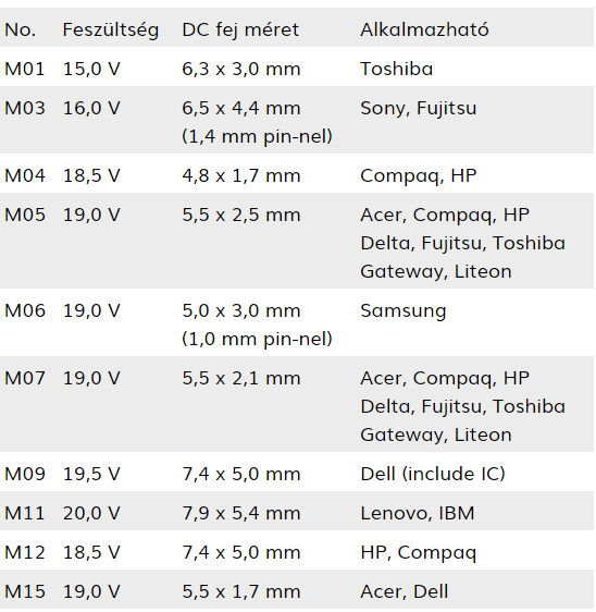 A csatlakozók által támogatott márkák: ACER, Sony, DELTA, IBM, DELL, Compaq, HP, Liteon, Toshiba, Fujitsu, Gateway, Lenovo, Samsung