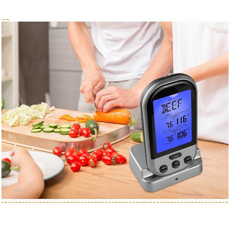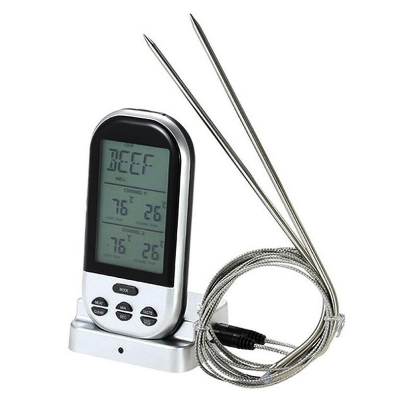 Praktikus és pontos rádiójel vezérlésű vezeték nélküli grill húshőmérő konyhába, kertipartikhoz, grillezéshez, barbecue sütögetéséhez -beszúrós szondával.