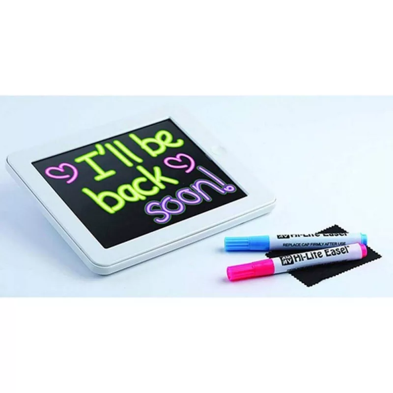 A táblára különleges filccel tudnak rajzolni, írni a gyerkőcök, és amint kész az alkotás csak fel kell kapcsolni a tábla világítását. Így a szöveg is világítani fog. A táblán 7-féle háttérszín közül válogathatnak a gyerekek, a csomagolás pedig kétféle filcet tartalmaz, így a lehetőségek tárháza igen széles. A tábla a csomagolásban található kendővel letörölhető, így bármikor újra indulhat az móka. A tábla pici és könnyű, így útközben is használhatják kedvenc játékukat a gyerekek.