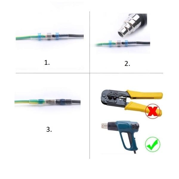 Nem lesz szükséged a pákára, cinre, szigetelőszalagra, ha össze kell forrasztanod két vezetéket. Mindössze ennyit kell tenned: Helyezd rá a forrasztóhüvelyt az egyik vezetékre. Sodord össze a vezetékek végét, illeszd a hüvelyt oda, ahol a két vezeték érintkezik.